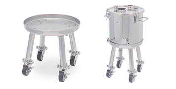 汎用プロセス容器対応のステンレス製キャスター台車、作業動線や安全性を考慮して設計されています。