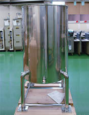 カスタマイズポイント:可搬型攪拌機取付座付きで脚長さをカスタマイズ可能なスロープ攪拌容器。 開閉型上蓋と攪拌軸用切欠きカバーを装備。 排出用バタフライバルブ採用、内外面はバフ研磨仕上げ。