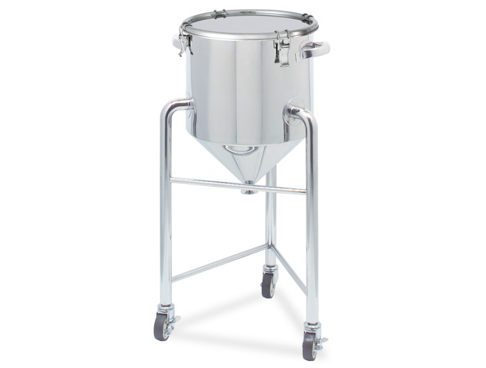 底面に90°の円錐ホッパーを備えた構造により、内容液を残さず効率よく排出できるステンレス容器です。